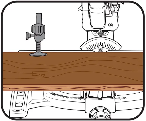 - Inspect your workpiece before cutting. If the workpiece is bowed or warped, clamp it with the outside bowed face toward the fence. Always make certain that there is no gap between the workpiece, fence and table along the line of the cut. Bent or warped workpieces can twist or shift and may cause binding on the spinning saw blade while cutting. There should be no nails or foreign objects in the workpiece.