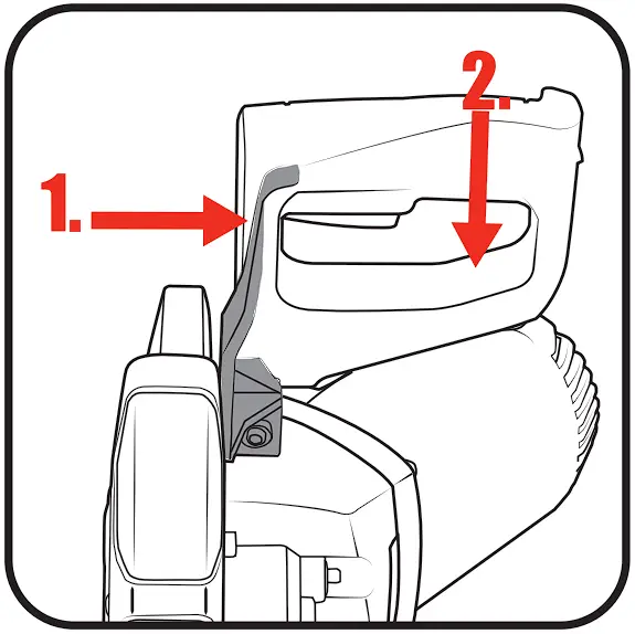 - Release cutting head from its transport position. While holding the head of the saw down release the lock down pin.