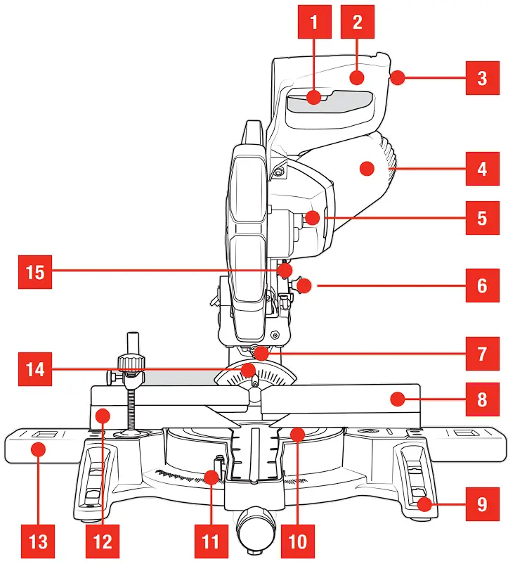 - Hold the handle firmly when making an incomplete cut or when releasing the switch before the saw head is completely in the down position. The braking action of the saw may cause the saw head to be suddenly pulled downward, causing a risk of injury.