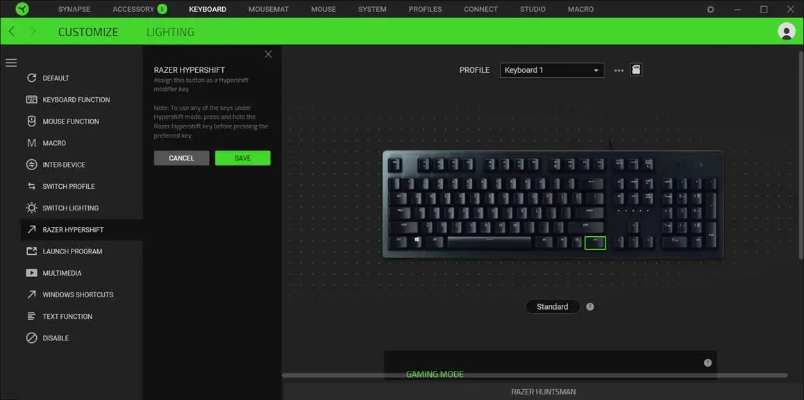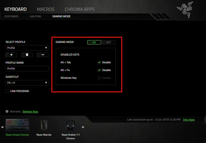 The Gaming Mode disables the Windows Key function to avoid accidental usage. Furthermore, you can maximize the effect of Anti-Ghosting by activating the Gaming Mode function. You can also choose to disable the Alt + Tab and Alt + F4 functions by changing the Gaming Mode settings in Razer Synapse 2 and 3. An indicator will light up when Gaming Mode is active.