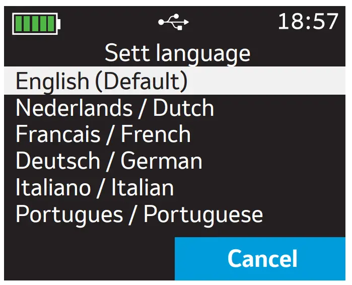 The default display language will be English at first start-up. You can change the language by accessing the menu, going to “setup,” and choosing “set language.” Navigating the options using the direction keys, you can then select your language preference by pressing ENTER.