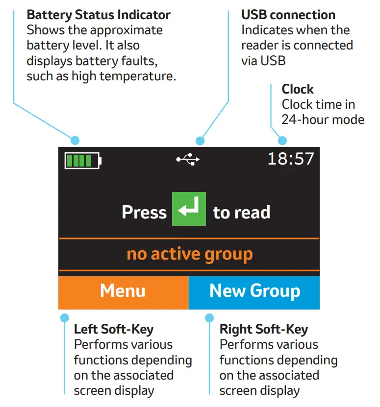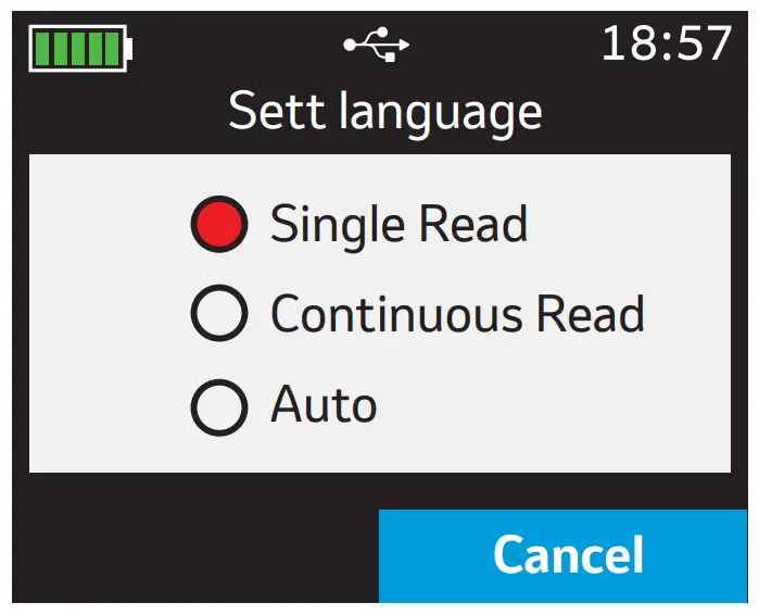 When fully charged, the battery info will show ‘100%,’ and you can see a rough estimation for operating time in Standby Mode and continuous Read Mode.
