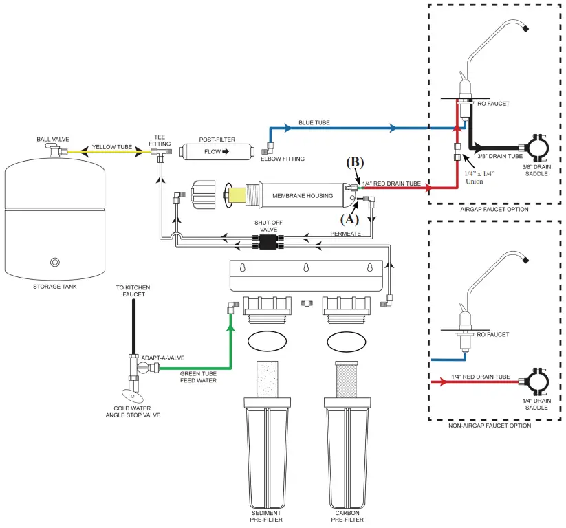 Step 7 Determine if a 1/4″ tube connection or 3/8″ tube connection drain saddle should be installed. For air-gap RO faucets (3 tubes) use larger 3/8″ tube connection drain saddle. For non air-gap RO faucets (1 tube) use 1/4″ tube connection drain saddle.