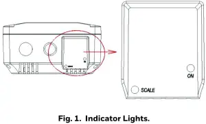 The bottom right side of the device is the indicator area. For this monitor (Part number: C7355B1052), only refer to the ON and SCALE indicators.