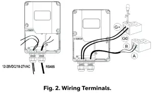 Wired communication (Modbus RS-485) is available for the device. The wiring terminals are shown below for detailed wiring and installation, please refer to Mounting Instructions.