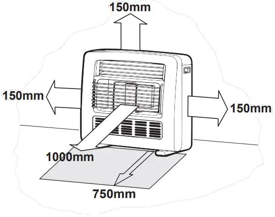Heat radiating from the front of this heater may over time affects the appearance of some materials used for floorings such as carpet, vinyl, cork or timber. This effect may be amplified if the air in the room contains cooking vapors or cigarette smoke. To avoid this possibility, it is recommended that a mat or similar protective sheet be placed in front of the appliance, extending at least 750 mm in front of the wire dress guard (1000mm Clearance to furniture).