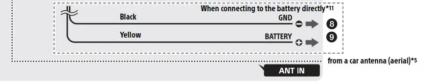 *11 When the amperage rating of the fuse used on your car is 10 A, make the power connection to the battery directly to avoid short circuits.