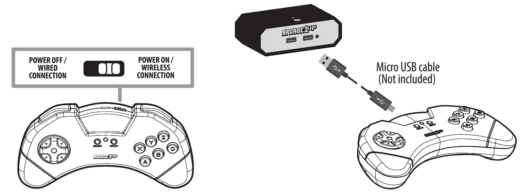 Turn the controller power switch to the left if you use wired connection. Turn to the right if you use wireless connection.