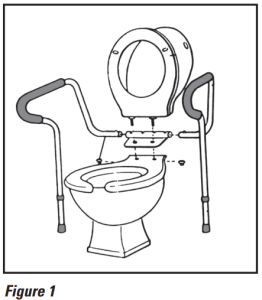 - Place toilet safety frame bracket between toilet fixture and toilet seat / lid assembly with rounded part of bracket facing back of toilet (Figure 1).
