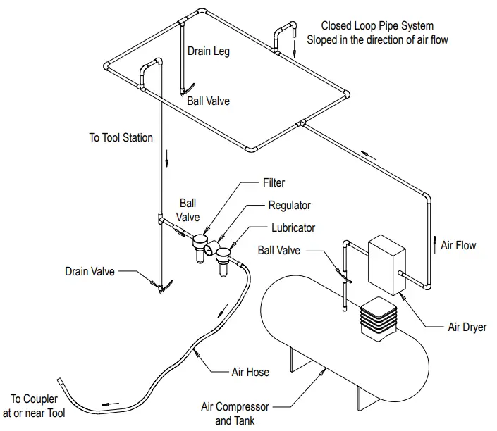 Use a clean lubricated air supply that will give a measured air pressure at the tool of 6.2 bar (90 psig) bar when the tool is running with the lever fully depressed. It is recommended to use an approved 10 mm (3/8 in.) x 8 m (25 ft) maximum length airline. It is recommended that the tool be connected to the air supply as shown in Figure 1.