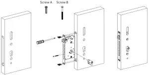 - Align the Strike Plate and Box with the holes drilled and protect them with Screw A. Screw A