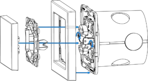 - Insert the device with mounting frame into the mounting box and secure with mounting claws and screws.