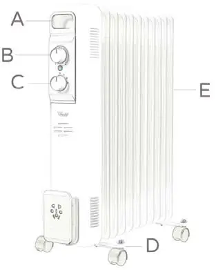 | A. Handle B. Thermostat knob C. Switches D. Base with wheel E. Elements |