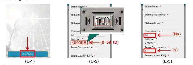 After logging account, click “Add Station” Like Figure E-1, fill in the Information and fill in the 8-digit code on the back of the Modem into the corresponding items. For example, E-2. For the electrical box option, please select “None”, and fill in “1” “Figure E-3