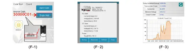 When the creation of the power station is completed, the page will automatically jump to the interface for adding an inverter (make sure the inverter has been installed correctly), fill in the 8-digit ID on the inverter and click Add such as F-1, after the addition is completed You can return to query the working status of the inverter F-2 and view the basic operating status of the power station F-3.