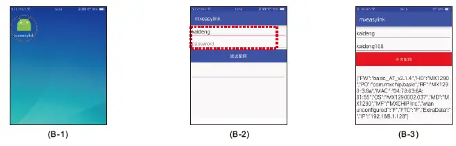 Connect the wireless network of your mobile phone to your home wireless signal source and open the Mx Easy Link client B-1, fill in the wireless SSID and password in the software. When the collector is in the (A-2) state, click the send command button B-2, The system will automatically configure the network until the data string is received, and the network configuration is successful (B-3).