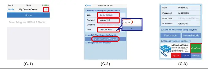 Open the MxEasyLink client, click “+” in the upper right corner C-1 to create network configuration settings and fill in the SSID and password, and select the mode as “EasyLink AWS”. When the collector flashes quickly as shown in Figure(A-2), click “Start EasyLink AWS Mode” button is like C-2. When the distribution network receives the module data and returns C-3. Click “Confirm” to complete the network configuration.