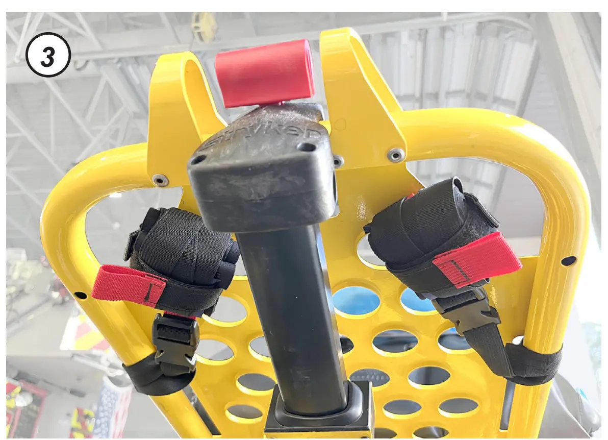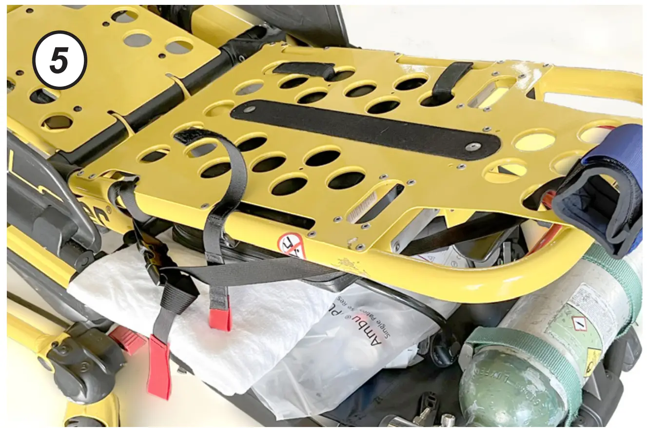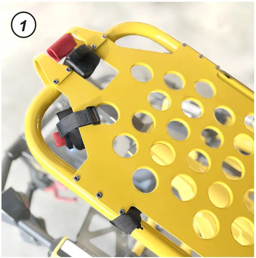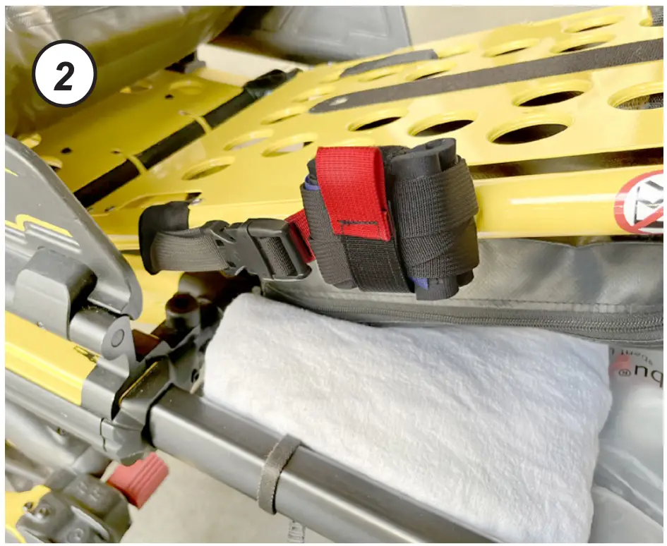 - Loop the stretcher anchor around the frame rail as shown and secure within the XDcuff® Cuff Securement Strap (CSS).
