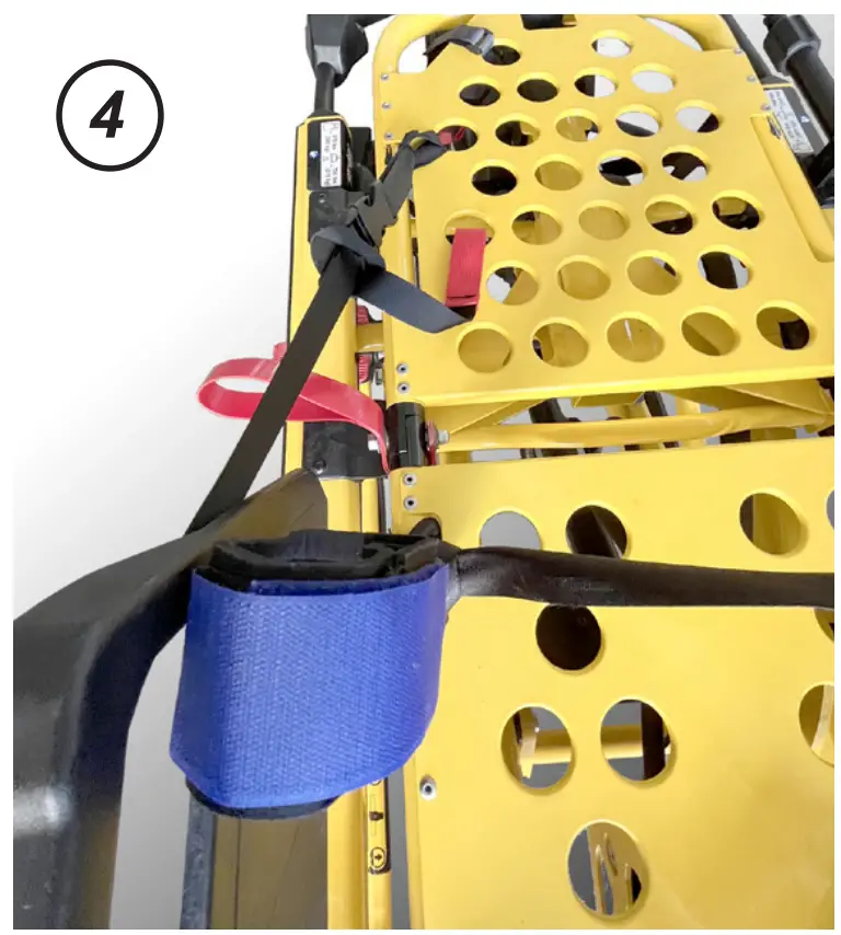 - As with the left wrist, loop Stretcher Anchor around frame rail as shown and secure within the Cuff Securement Strap.