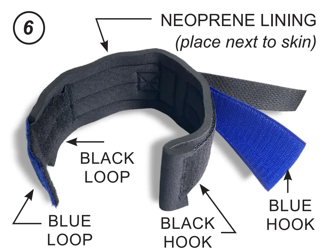- Wrap the cuff around the wrist with the soft Neoprene portion towards the patient’s skin. Attach the black hook-andloop portions first, followed by the blue hook-andloop portions as shown in FIG 6.
