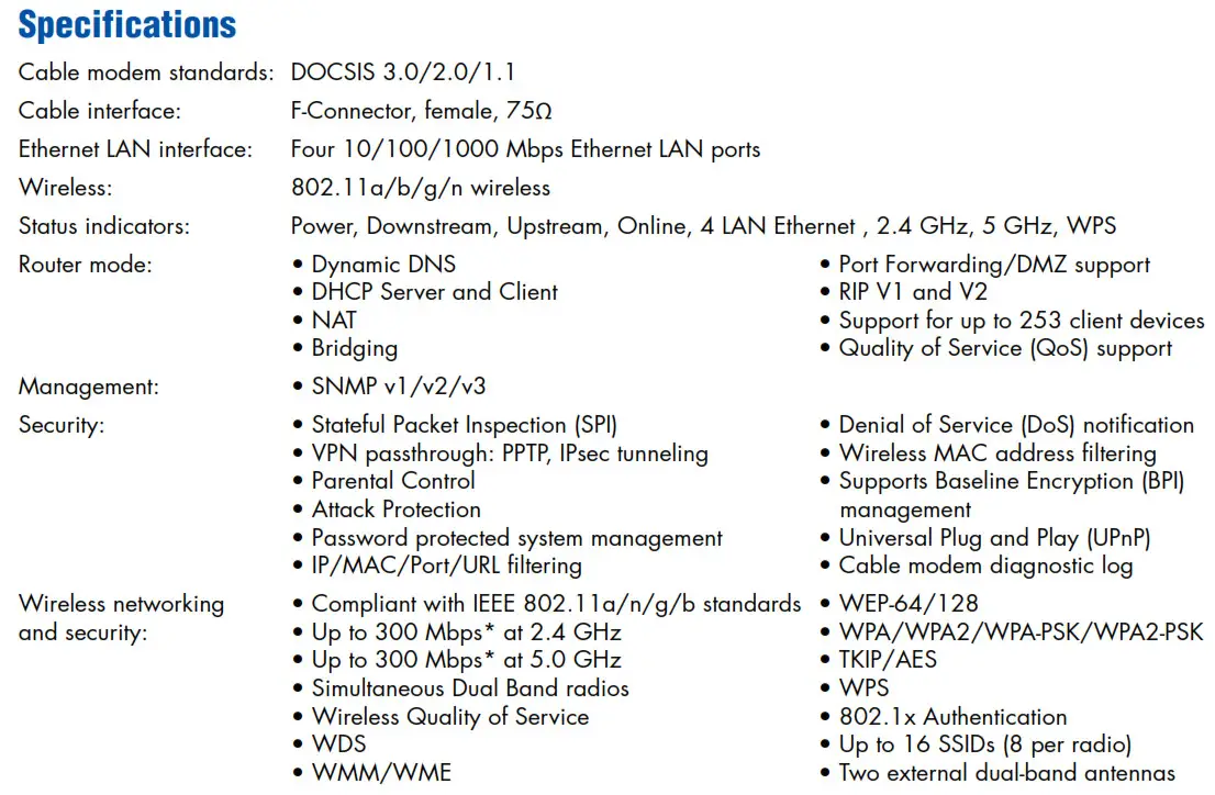 - DOCSIS 3.0/2.0/1.1 maximizes performance and compatibility.
