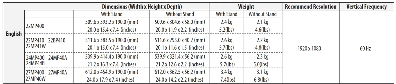 22MP41W 24MP44B 27MP40W 27MP400 27MP40A 24MP400 24MP40A 22MP410 22MP400