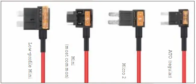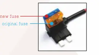 - Remove the fuse in your car’s fuse box and put it into the empty slot in the piggyback fuse cable (“original vehicle fuse” in the image).