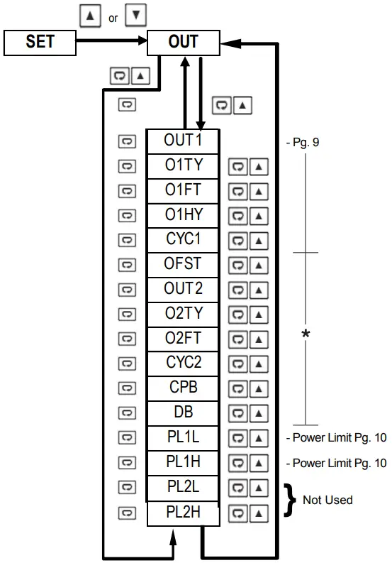 key to get “oUT” in the lower display. Then, use the key to cycle through the “oUT” menu parameters.