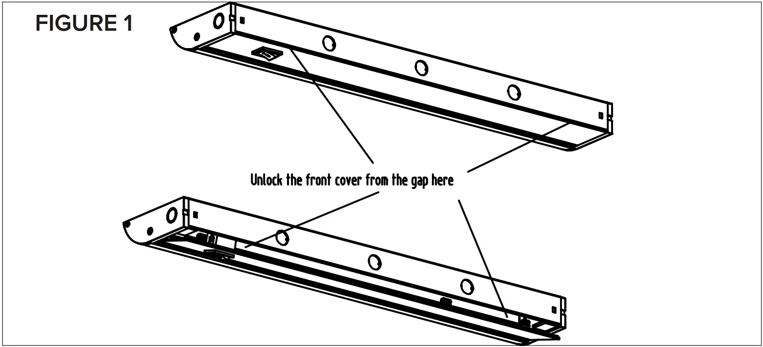 - Unlock the front cover of the fixture by using a flat head screwdriver to pry between the gap to release the clips. See Figure 1.