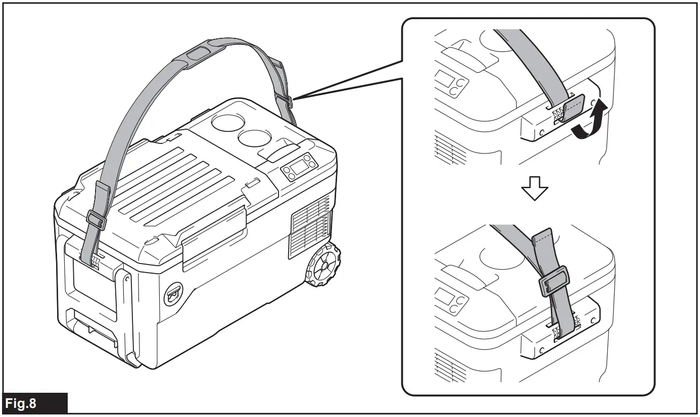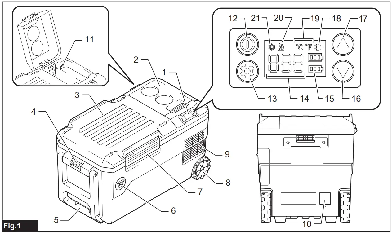 – Camping use only when the appliance powered by battery pack. - This appliance uses FLAMMABLE REFRIGERANTS. Read and follow this instructions for handling. Ask our service center for servicing. When disposing the appliance, follow your local regulations relating to disposal of FLAMMABLE REFRIGERANTS.