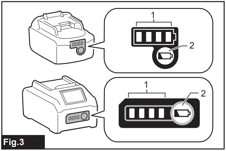 Press the check button on the battery cartridge to indicate the remaining battery capacity. The indicator lamps light up for a few seconds.