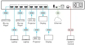| Example (route video HDMI IN 4 to video HDMI OUT 1): | “#X-ROUTE OUT.HDMI.1.VIDEO.1,IN.HDMI.4.VIDEO.1”,0x0D | ||