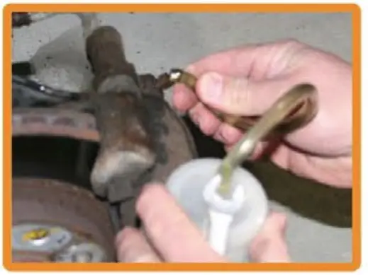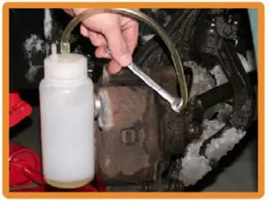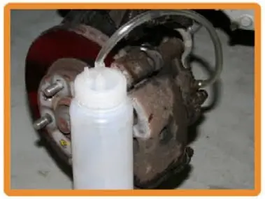 ![]() | Attach the tube from the used fluid bottle to one of the vehicle’s bleeder screws. You may need to verify that the bleeder screw can be opened before attaching the tube. The bottle may be mounted to the caliper using the attached magnet. Connect the battery cables. | ![]() |