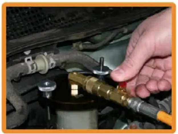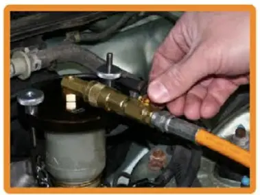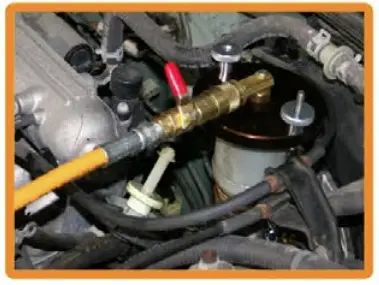 ![]() | Remove master cylinder cap. Find correct master cylinder adapter from adapter kit and attach to master cylinder reservoir. Connect yellow pressure hose to master cylinder adapter. | ![]() |