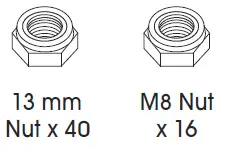 - Choose which side to install On the side without the handle, thread four 5/16 x 1/2″ bolts and four 13 mm nuts to each corner. On the side where handle will be installed, only thread two 5/16 x 1/2″ bolts and two 13 mm nuts on top, leaving the bottom holes open.