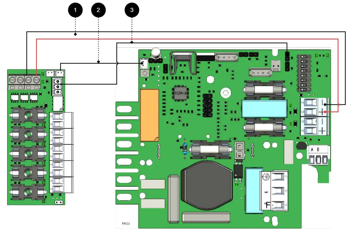 + and – from load on motherboard is connected to + and – on the option card. Communication is connected between terminals as the solid line shows.