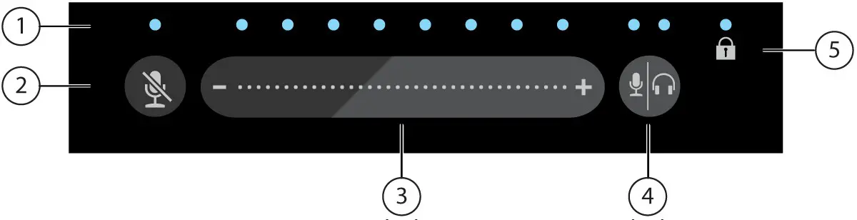 - LED bar Displays microphone and headphone level. The LED color indicates which level is being displayed or adjusted.
