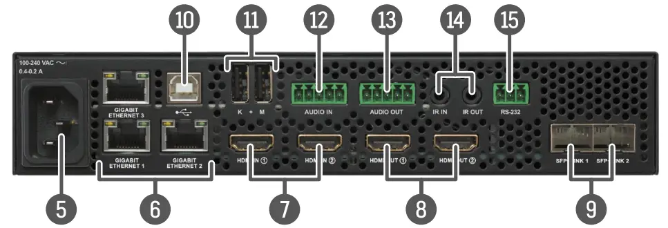 When the device is configured as a transmitter, the ports operate as local HDMI outputs. - SFP+ port slots