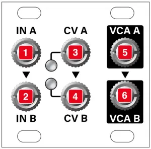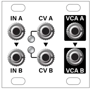 IN A [1] is normalled to IN B [2] , so if nothing is inserted into IN B , then IN A feeds both VCA A and VCA B. - CV A – The CV input for controlling the linear amplification level of VCA A.