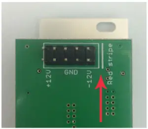 Ensure the 10-pin connector on the power cable is connected correctly to the module before proceeding. The red stripe on the cable must line up with the -12V pins on the module’s power connector. Different modules use different ways to indicate the -12V pins.