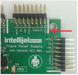 The other end of the cable, with a 16-pin connector, connects to the power bus board of your Eurorack case. Ensure the red stripe on the cable lines up with the -12V pins on the bus board. On Intellijel power supplies the pins are labelled with the label “-12V” and a thick white stripe: