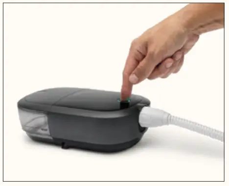 The machine should start automatically. If you do not hear the machine start, press the Therapy button on top of the machine. Relax and begin to take slow breaths through your nose.