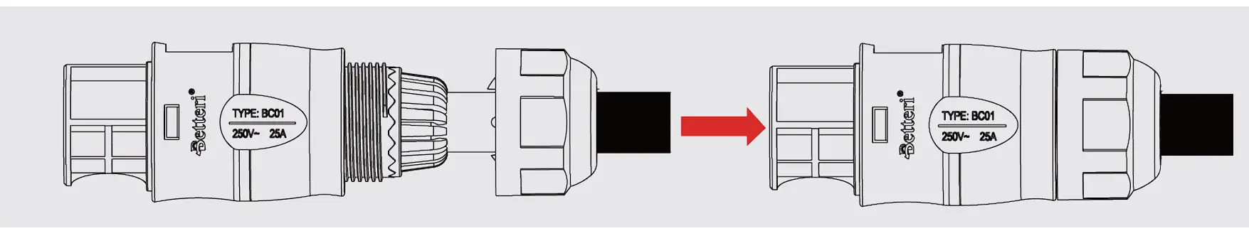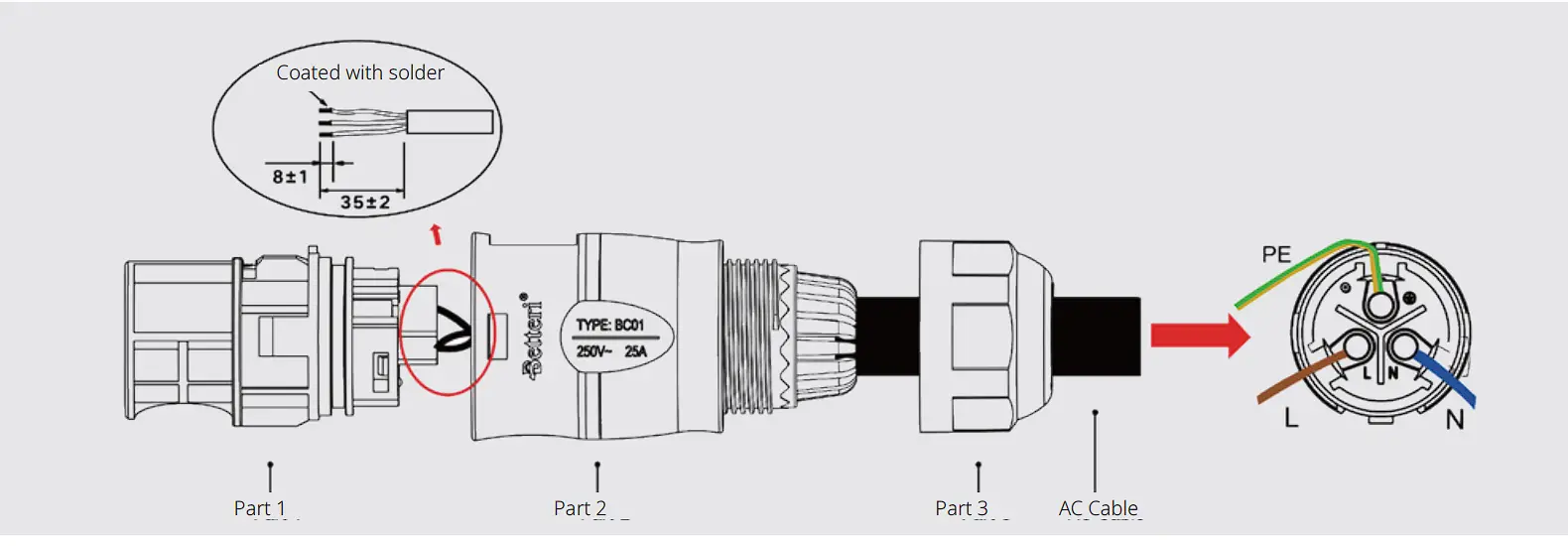 - Plug the AC port Part 2 into Part 1 once the wiring is complete, and then screw on Part 3 to complete the AC extension cable.