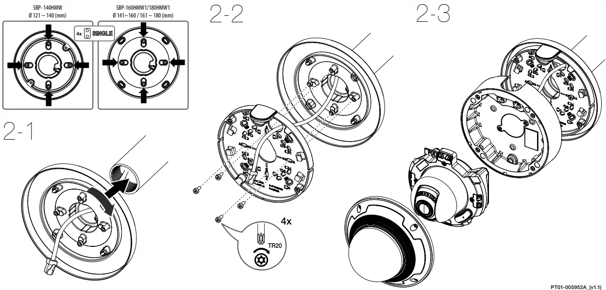 - Make sure that the installation place can endure at least 4 times of the total weight of the Hanging Adaptor, Camera, and Wall/Ceiling/Parapet Mount.
