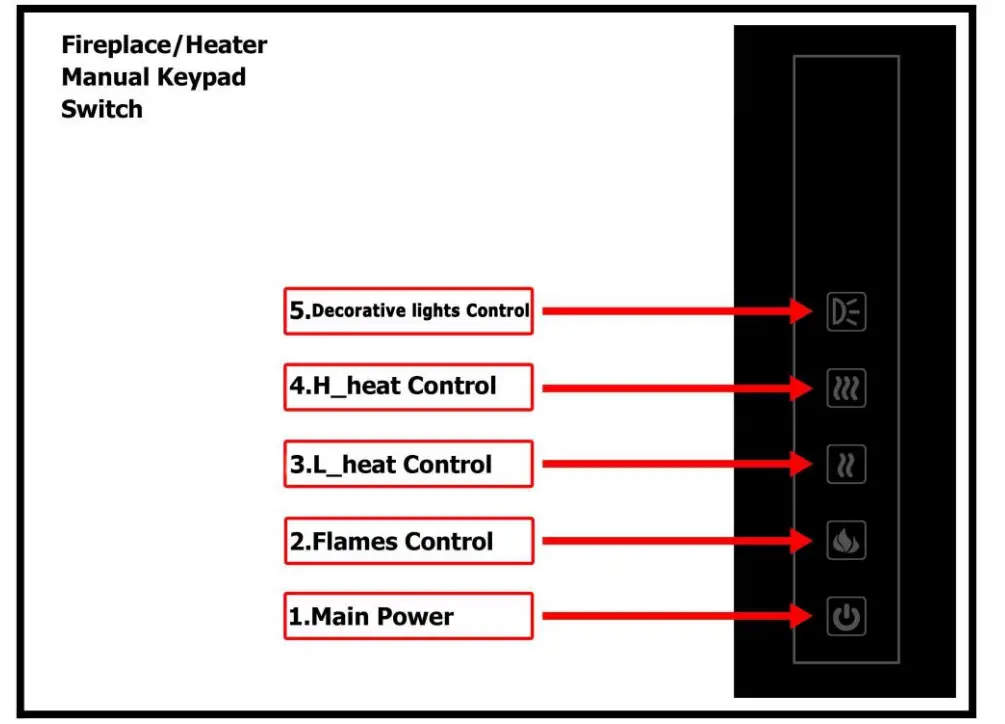 Pressing the next button (3) L heat Control, cycles the low heat ON and OFF, whilst the (4) H_heat Control button cycles the high heat On and OFF. The fuel bed lights will flash one time to indicate that the heat function is ON or OFF.