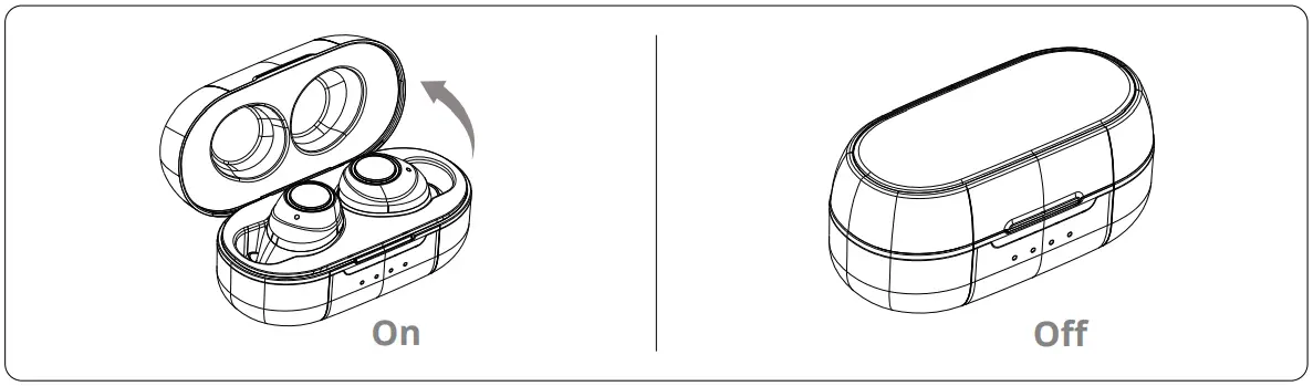 - The earbuds will automatically power on when the charging case is opened and w ill power off when the charging case is closed.