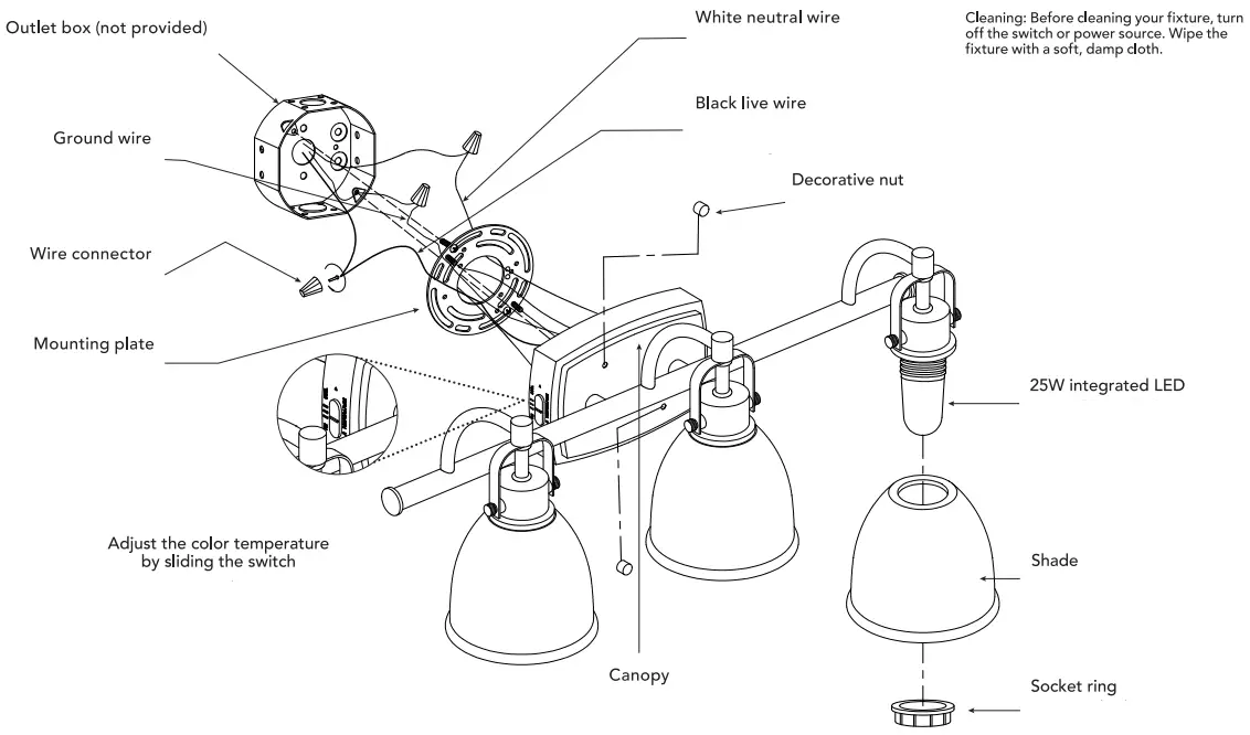 integrated 25 watt LED, 1780 lumens, 90CRI, 50,000 hrs, color temperature control (3000K-4000K-5000K)