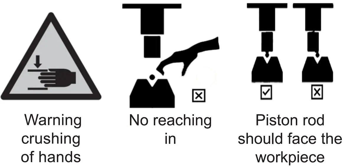 ✘ DO NOT apply off-centre loads. Ensure that workpiece is centrally loaded and correctly secured before operating the press.