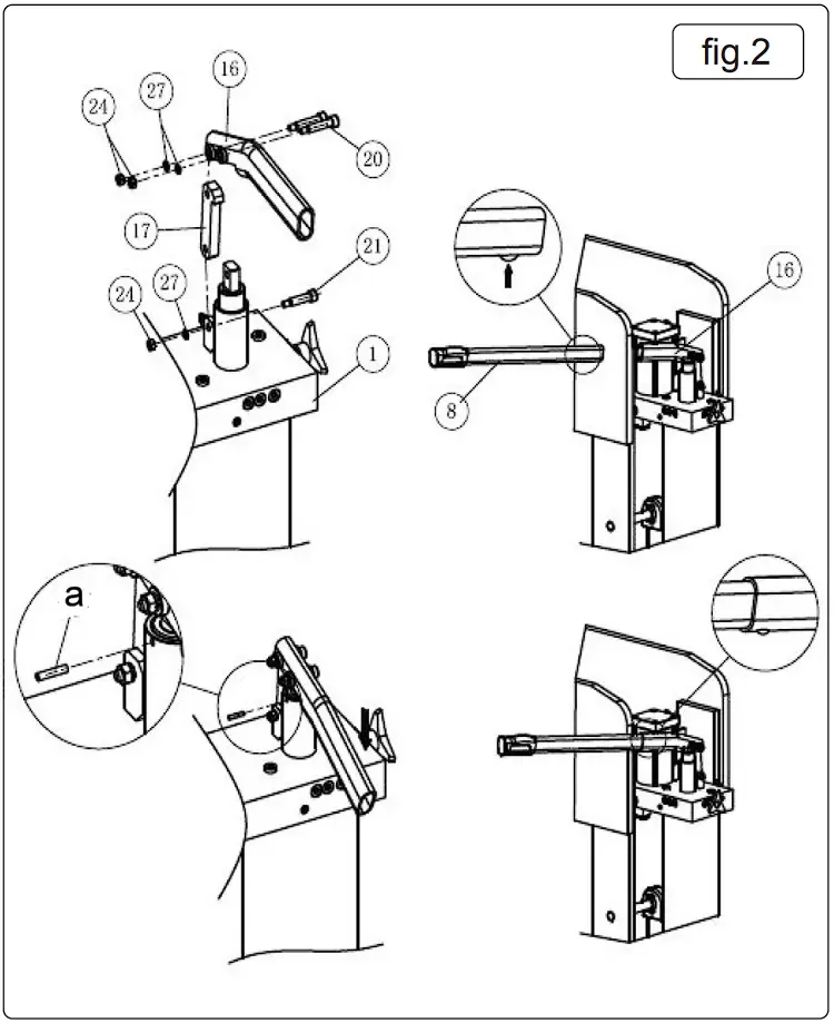 5.2.3. Press button on handle part 8 and part 16. After inserting make sure button pops up.