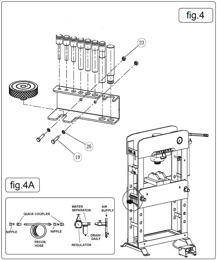 6.1.2. Connect air supply. Use clean, dry lubricated air supply. Pump working pressure is 0.9 – 1.2MPa. See fig.4A.